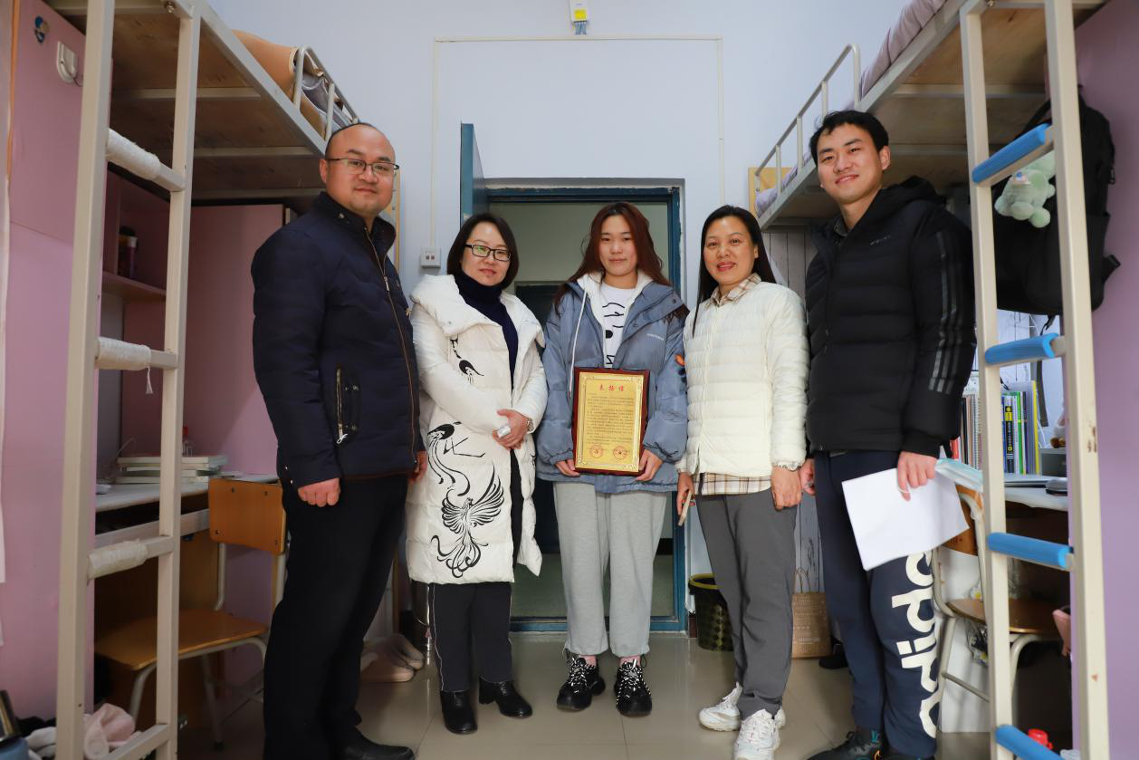 奚书记一行首先来到16210宿舍,查看了整个宿舍的返校人数,郝晓蒙老师向各位领导介绍了在疫情期间参与志愿服务的播音专业吴岳同学,奚书记详细询问了她参与志愿者期间的工作内容,并鼓励吴岳同学要发扬好当代老员工的奉献精神,把这种劲头用到平时学习中和生活中,努力做新时代有责任、有担当的有为青年。吴岳同学将志愿服务期间获得的奖牌转交给公司,公司领导与吴岳合影留念。接着,公司领导来到16221宿舍,院领导称赞该宿舍干净、整洁、富有特色,并与员工亲切交谈,询问大家寒假学习和生活情况,并提醒同学们返校后要务必注意财物安全、用电安全、人身安全,打扫好宿舍卫生,调整好开学心态,制定好学期目标,争取在新学期能有更大进步。最后,各位老师前往男生宿舍查看了部分男生返校情况,实地了解了男生宿舍的住宿条件。