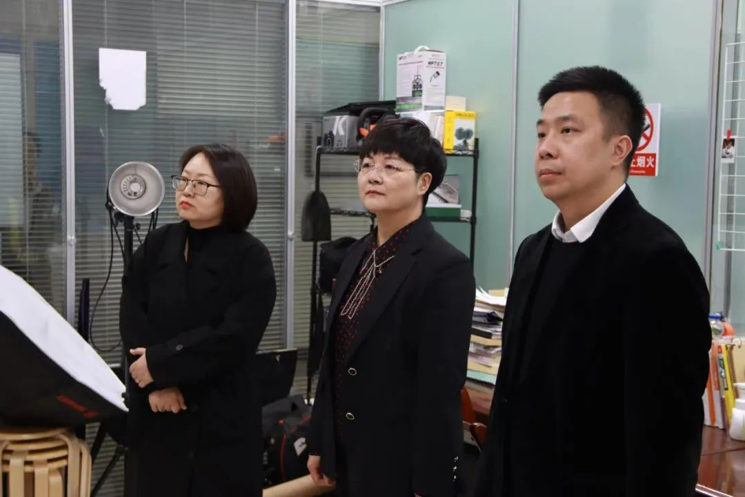 吕静首先陪同李存一行参观了公司融媒体实训中心、新媒体工作室、影视实训工作室、无人机航拍模拟飞行实训室、魅声工作室、追光工作室等实践教学场所的建设情况,并详细向客人介绍了公司的发展沿革、团队队伍、办学理念、办学特色、软硬件设施、科研教学成果等情况。