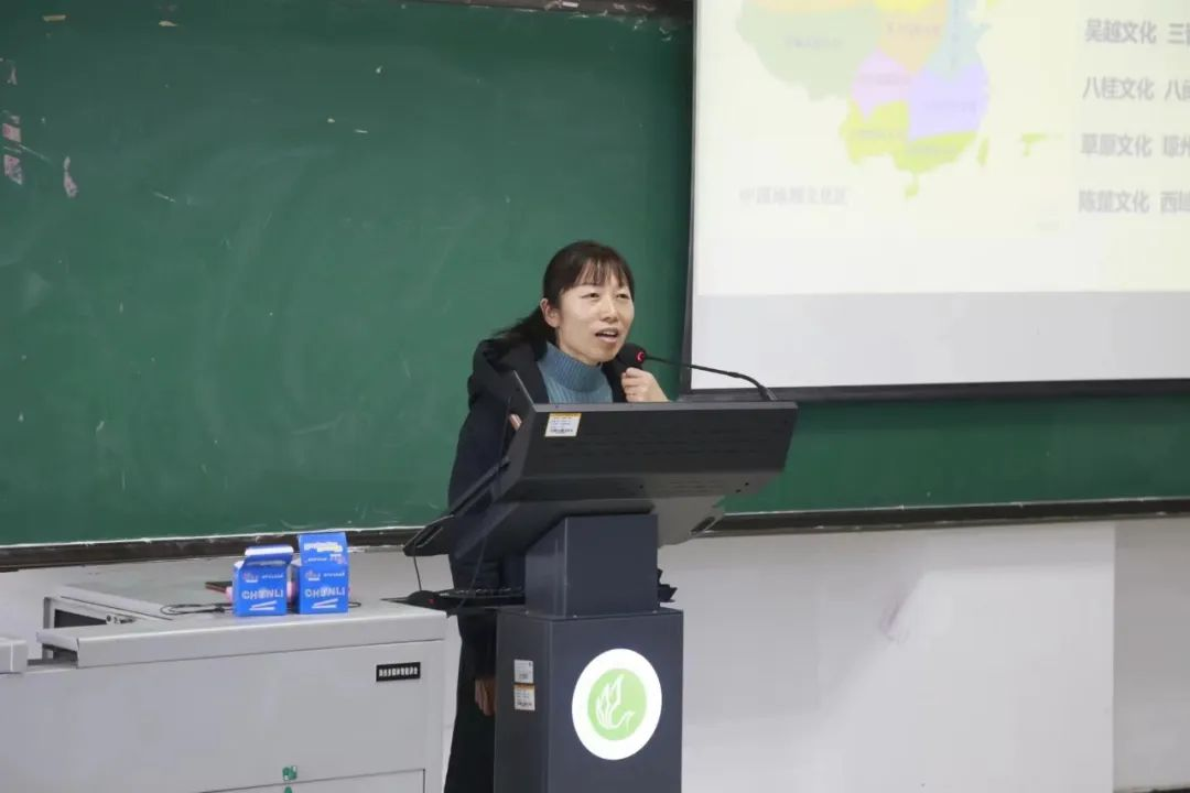 张玉华老师从地域文化出发,围绕地域文化与专业发展二者关系,结合地域文化,提升专业能力三大部分展开讲座,以通俗易懂的方式,带领同学们感受生动有趣的民俗文化。在第一部分针对“地域文化”的内容,张玉华老师先首先向同学们阐述了地域文化及文化分区的概念,随后以中州文化为例,着重介绍了中州丰富的地域文化资源。通过对“中州的古代哲学”,“中州的古代文学”,“中州的语言文字学”,“中州的科技”,“中州的艺术”,“中州的都市文化”六大部分的讲解,使同学们充分感受到了中原地区丰厚的文化底蕴。