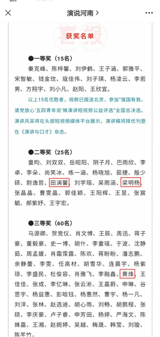 近日,由《演讲与口才》杂志社指导,中国语文报刊协会演讲与口才分会、北京演讲与口才学会主办的“五四青年说”微演讲短视频公益评选活动华中选区圆满完成,获奖结果揭晓,公司2019级播音与主持艺术专业梁明杨同学,2020级播音与主持艺术专业田澜馨同学在此次活动中获得二等奖,2020级播音与主持艺术专业黄烽同学在此次活动中获三等奖。