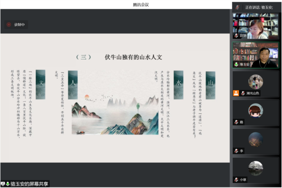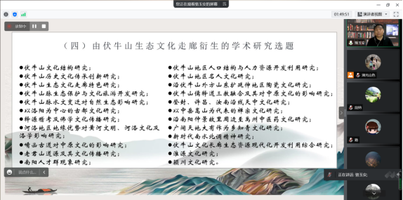 在此次线上讲座中,骆玉安教授首先从“伏牛山文化圈”说开,以更加宽广的视野对伏牛山脉及其周边地区的文明历史和文化脉络进行梳理和研读,提出横亘中原的伏牛山是华夏龙脉的根须,伏牛山有着独特的山水人文,许多中原儿女对伏牛山都有着一种难以割舍的地域情怀。作为有担当的文化学者,满腔热情拥抱新时代,科学梳理伏牛山文脉,创新和打造以黄河文明和中原文化为标志的沿伏牛山生态文化走廊,具有重要的现实意义和长远的战略意义。