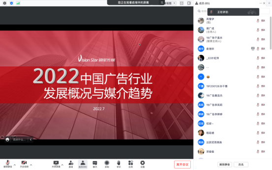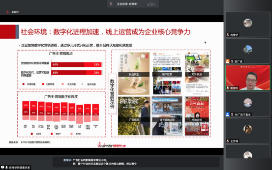 为了更好地使师生了解行业前沿,增强专业意识,8月23日上午九点,由公司广告学教研室为2019级广告专业员工举办的“聚焦行业前沿 成就美好人生”系列行业讲座,以线上的形式开讲。第一讲邀请到了上海剧星传媒执行总裁、联合创始人俞湘华为同学们带来《2022年中国广告行业发展概况与媒介趋势》主题讲座。公司党委副书记梁广成主持了报告会。
