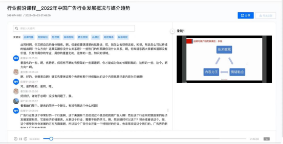 接下来,俞湘华总裁围绕2022年中国广告行业发展概况与媒介趋势用详尽的数据为同学们带来了精彩的讲座。他向同学们介绍了2021年的宏观环境和广告市场概览,并分别详细讲解了电视媒体发展与趋势、网络短视频媒体格局变化与趋势、短视频媒体格局变化与趋势、电商平台媒体格局变化与趋势、kol广告格局变化与趋势。他用真实的数据进行对比,对2021年中国互联网公司广告营收进行了说明,指出目前市场规模主要集中与电商广告及短视频广告,广告的形式也变得越来越快捷、精准和有趣。