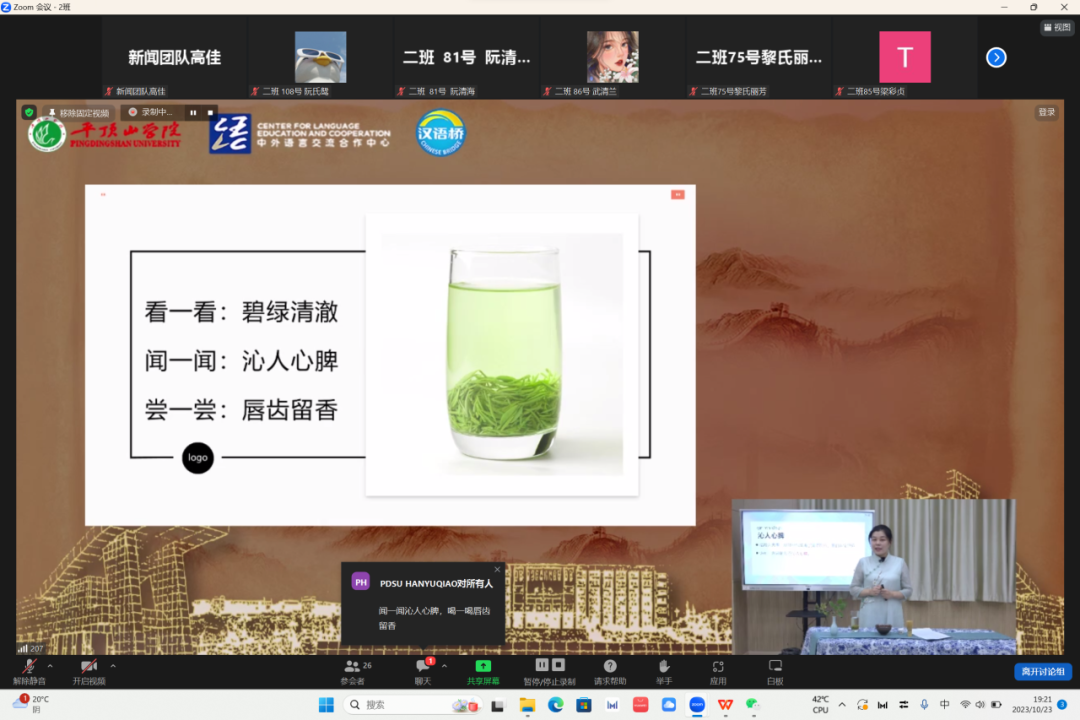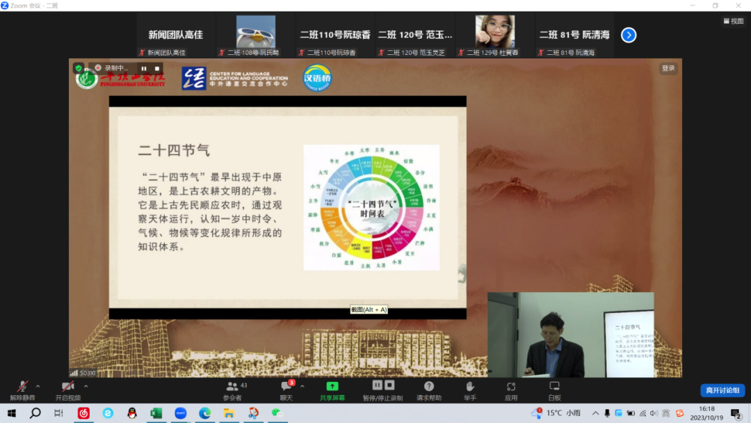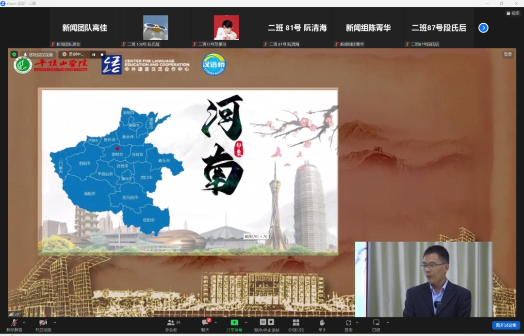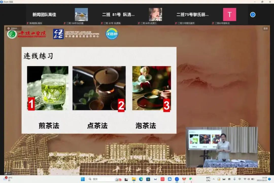 自10月19日2023“汉语桥——‘循地图,探民俗’”线上团组交流项目开营以来,以中原民俗文化为主题的各类汉语课程持续进行。北京时间10月19-24日,路学军、王冰、赵柯益、崔霄、赵轩等十位老师,分别以特色民俗文化、古法烹茶、马街书会弹唱艺术为主题为国际学员们带来了精彩的线上课程。在汉语桥志愿者的配合下,近120余名学员在线参与了课程学习。