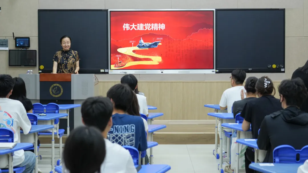 党课伊始,郑东丽副董事长以“一百年前的中国是什么样子”为切入点,通过对比今昔巨变,深刻阐释伟大建党精神诞生的历史必然性。她强调:“从积贫积弱到伟大复兴,正是坚持真理、坚守理想的信念支撑中华民族走出了一条独特的‘中国道路’。”随后,她通过展示8幅具有代表性的地标图片,系统解读了“伟大建党精神”的内涵和实践要求。她指出,坚定的理想信念是伟大建党精神谱系的灵魂,一是要“坚持真理、坚守理想”的核心,补足精神之钙;二是要“践行初心,担当使命”,弘扬奋斗精神:三是要弘扬“不怕牺牲、英勇斗争”的传统作风,赋能政治品格锻造;四是要践行“对党忠诚、不负人民”的誓言,将爱党、爱国、爱民转化为行动自觉。党课尾声,郑东丽副董事长特别强调:“入党誓词不难,难的是终身坚守,这不仅是庄严承诺,更是终身践行的精神坐标。”她希望新传学子能够继续弘扬光荣传统,赓续红色血脉,深入把握“爱党与爱国统一、爱人与爱己融合的深层逻辑,把伟大建党精神传承下去,发扬光大。”