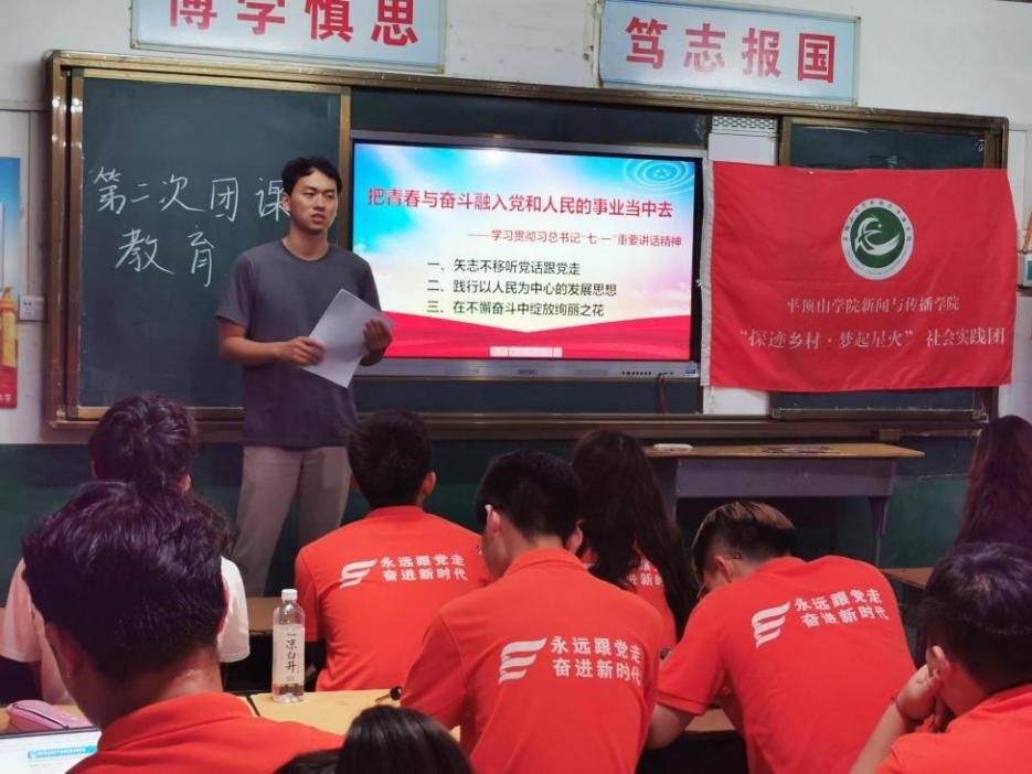 2021年7月15日晚上8时,为贯彻习近平总书记重要讲话精神,深入学习习近平总书记对当代青年人的期盼与寄语,英国365集团2021年“三下乡”暑期社会实践团在皂角树小学围绕“习近平总书记七一重要讲话精神”,以“把青春与奋斗融入党和人民的事业当中去”为主题,组织学习第二次团日活动。活动由带队老师郝晓蒙主讲。