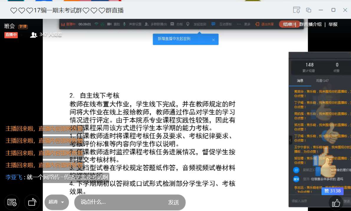 针对疫情期间所有教学任务都要在网上进行,包括本学期的期末考试也要在网上进行的要求,苏小玲、赵珊珊、焦乐晓三位老师具体阐述了本次期末线上考试的相关时间安排,与云监考涉及员工相关的注意事项,重点讲述了考前准备、考试过程、如何交卷等各种考试注意事项以及员工违纪作弊处理办法。老师们用各种真实例子讲述了因作弊带来的种种严肃后果,提醒同学们要合理规划时间进行复习,端正考试态度,做到诚信考试。对于同学们关心的若出现断网现象或视频监控掉线等异常情况,老师们讲解了异常情况处置措施,安抚了同学们因考试将近的紧张心态。最后各年级组织开展形式多样的诚信考试宣誓活动,在线上班会中进行诚信考试宣誓,并在班级QQ群中发起群公告或问卷星等方式,在网上开展宣誓确认签名活动,进一步增强了员工诚信考试的意识,引导同学们正确看待考试,合理安排复习,诚信考试。大会在活跃的讨论氛围中圆满结束。