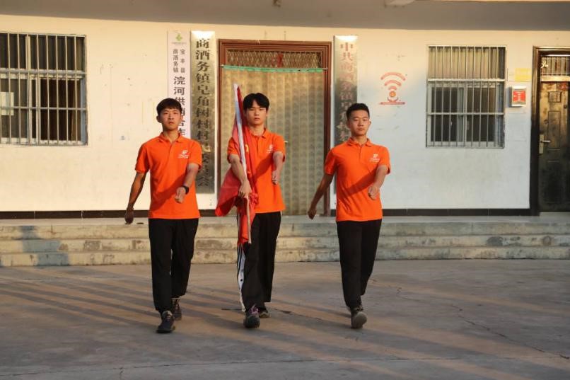 清晨,经过一夜雨水的冲洗,皂角树村蔚蓝的天空一尘不染,空气像被滤过一样格外清新。6点15分,郝晓蒙老师和志愿者们准时在皂角树村党群服务中心广场国旗台前集合。在郝老师的安排下,大家在指定位置站成整齐的队伍,等待升旗仪式的到来。