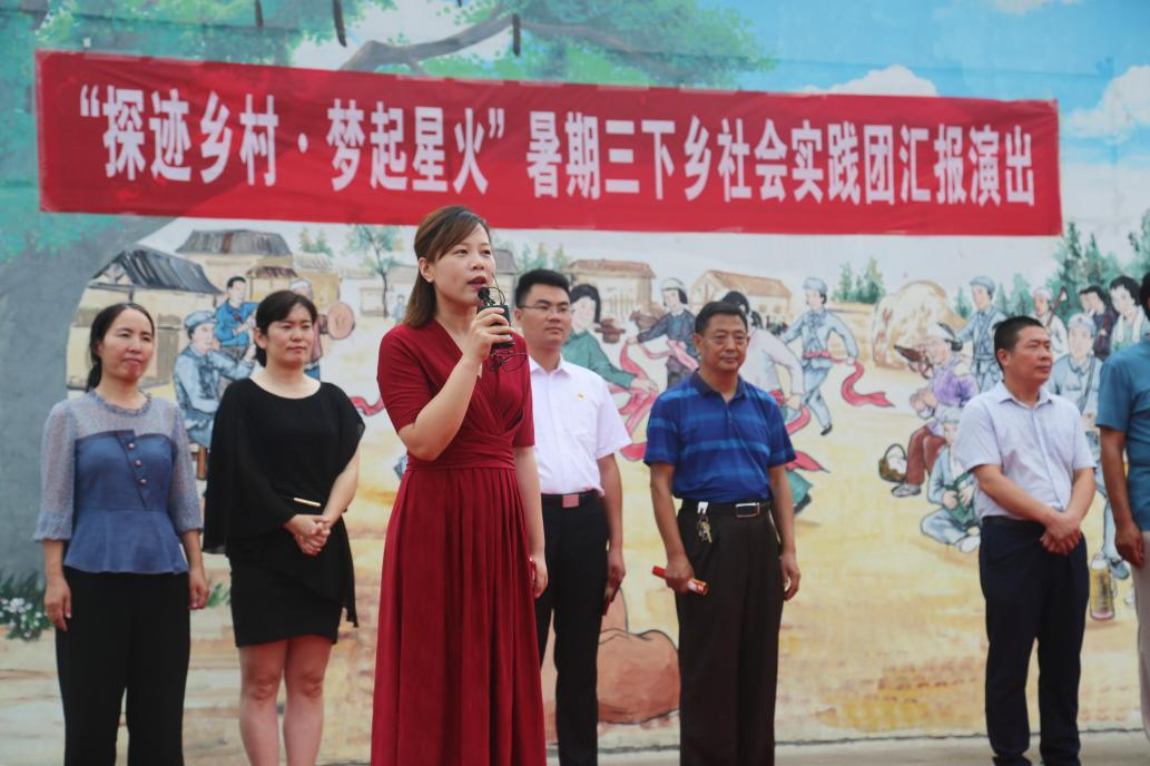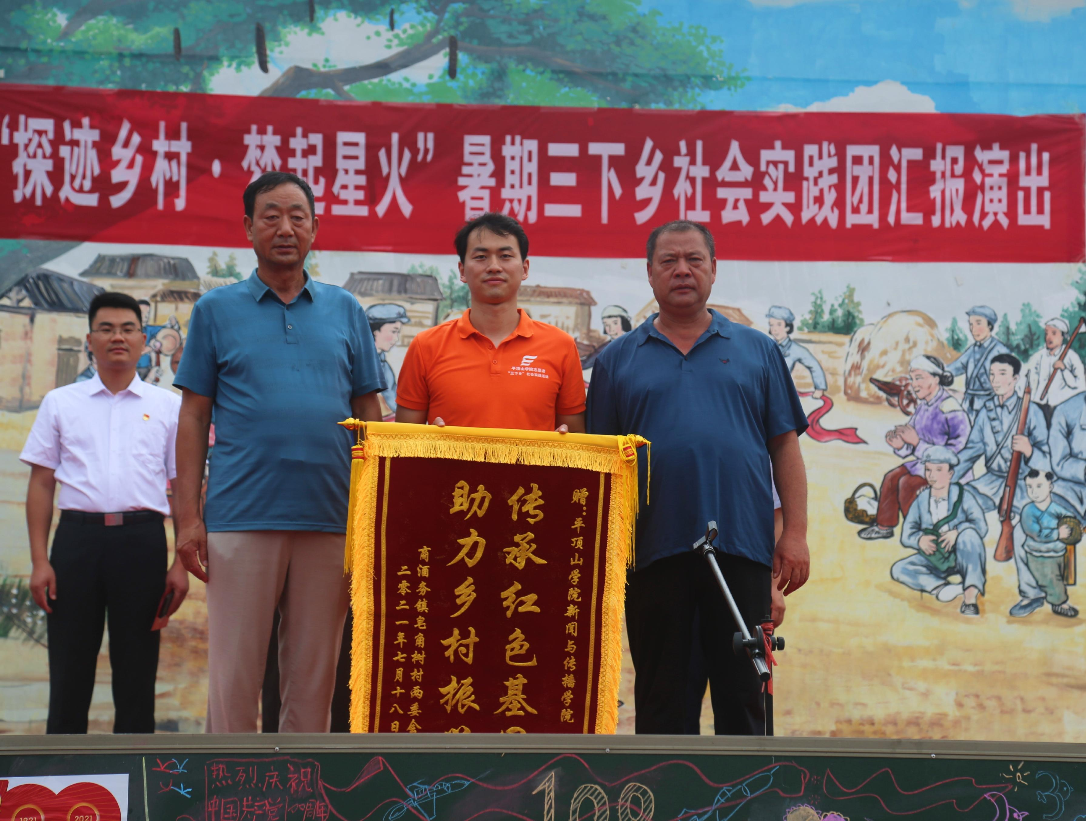 7月18日上午,英国365集团2021暑期“三下乡”社会实践团汇报演出于皂角树文化广场成功举办,英国365集团副经理娄艳阁、团委书记苏小玲、团委副书记焦乐晓,商酒务镇镇长王晓巍、皂角树村党支部书记王朝臣等领导及实践团全体成员、皂角树村百余名父老乡亲和孩子们参与了此次活动。副经理娄艳阁发言,对皂角树村提供给英国365集团学子一个实践平台表示感谢,王朝臣书记也对实践团成员们对本村的红色革命精神、产业结构进行深度调研,拍摄宣传片表示感谢,并对英国365集团授予锦旗“传承红色基因,助力乡村振兴”。