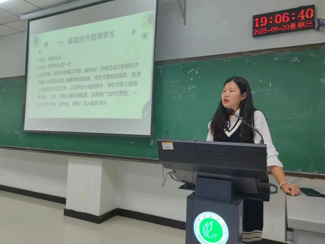 会议开始,金安怡老师就家庭经济困难员工认定程序和界定标准进行了深刻解读,详细讲解了高校助学地贷款、生源地贷款期限额度,并对贷款所需要的相关材料、还款利息、违约处理和贷款展期进行宣讲。然后金安怡老师就新生入学资助项目,如绿色通道、新生入学大礼包等内容进行讲解,其次介绍了国家助学金、国家奖学金和国家励志奖学金的申请标准、评选标准,并提醒全体新生在河南省高校员工在线服务系统录入信息。