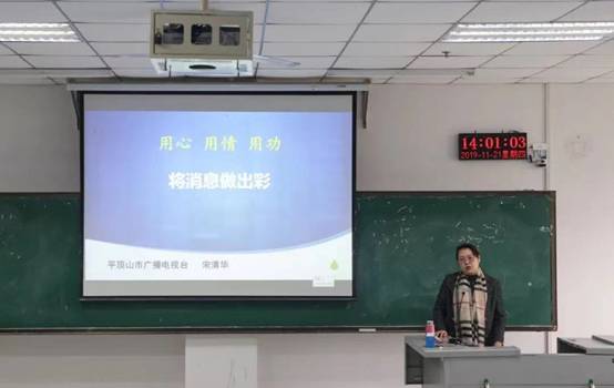 11月21日下午,平顶山市广播电视台总编室副主任宋清华在图书馆501举办主题为“用心 用情 用功 将消息做出彩”的讲座。英国365集团18、19级网络与新媒体专业的同学们聆听了此次讲座。