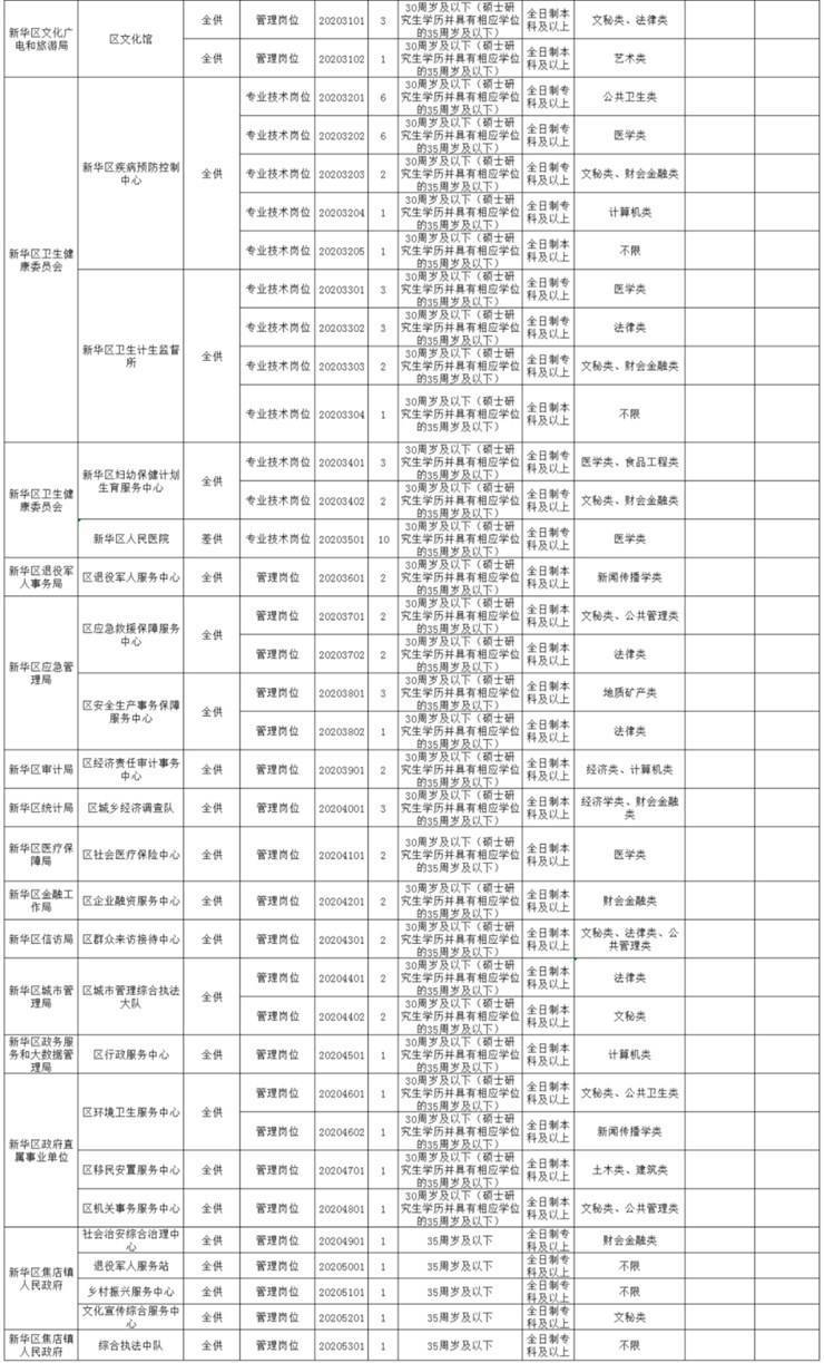 按照《事业单位人事管理条例》(国务院令第652号)、省委组织部 省人社厅《关于印发<河南省事业单位公开招聘工作规程>的通知》(豫人社〔2015〕55号)等文件要求,根据新华区用人单位编制空缺及岗位需求情况,现面向社会公开招聘事业单位工作人员175名(具体岗位见附件1)。